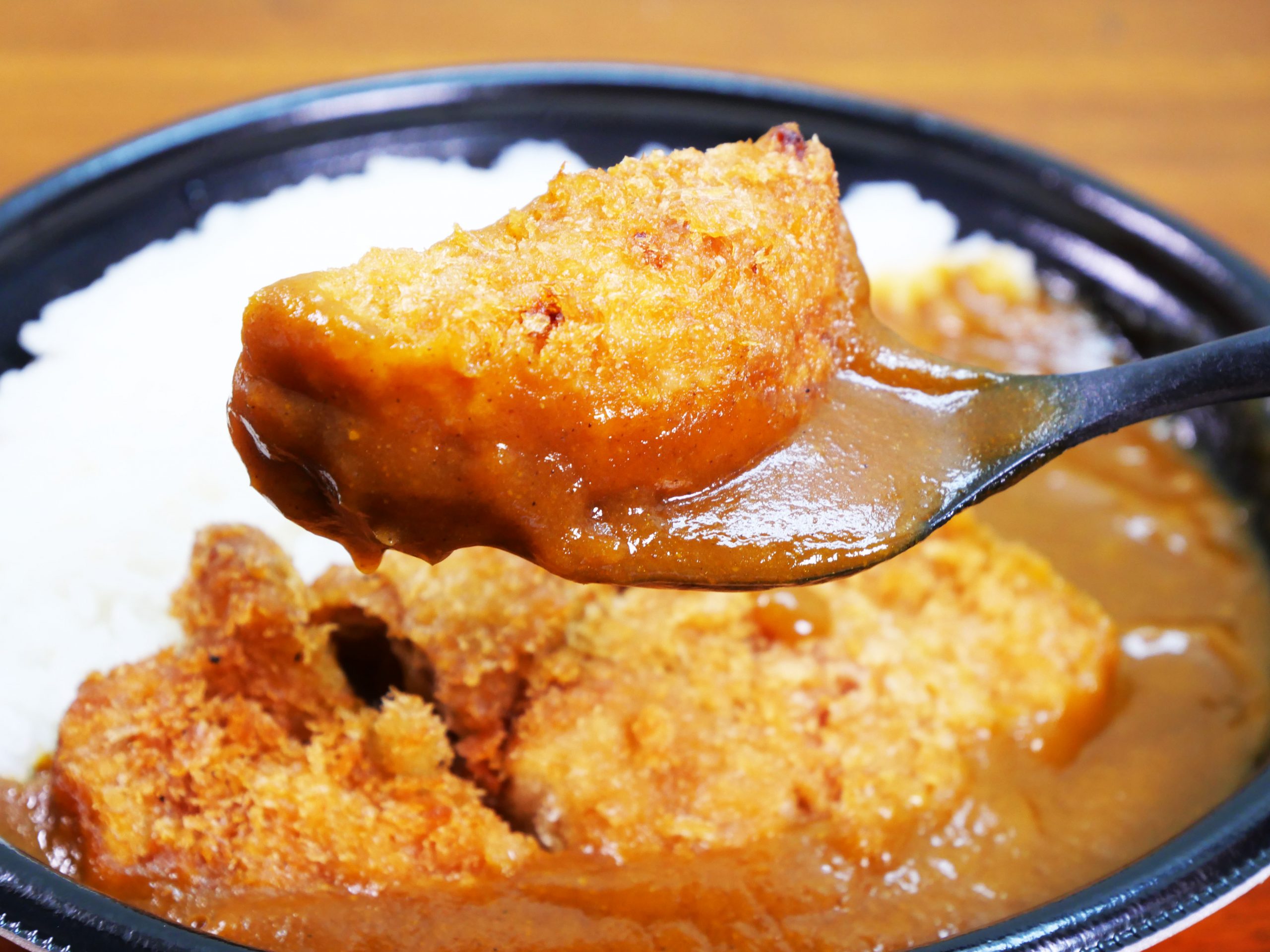 そして何より、カレーと衣の相性が良い。カレーは程よくスパイシーで、中辛寄りの甘口といえるレベル。そしてマッタリ感の強いスパイス感じるカレーが衣に染み込んで、薫り高さと旨味を高める。食べると心がぴょんぴょんするグルメであり、なんかイイんじゃあないかなァ。